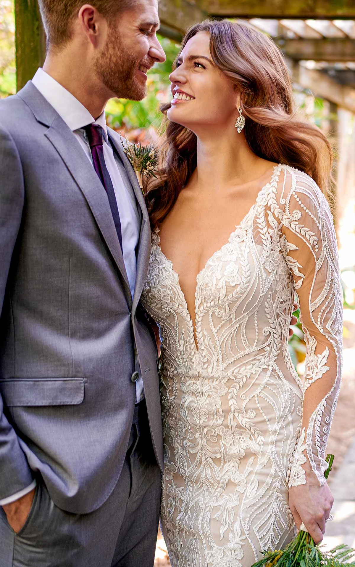 With a hint of subtle shimmer, the scalloped train features a glitter tulle underlayer for added dimension with every step. A clasp a the top of the back creates a wide keyhole opening, framed with organic floating laces to complete this head-turning look.