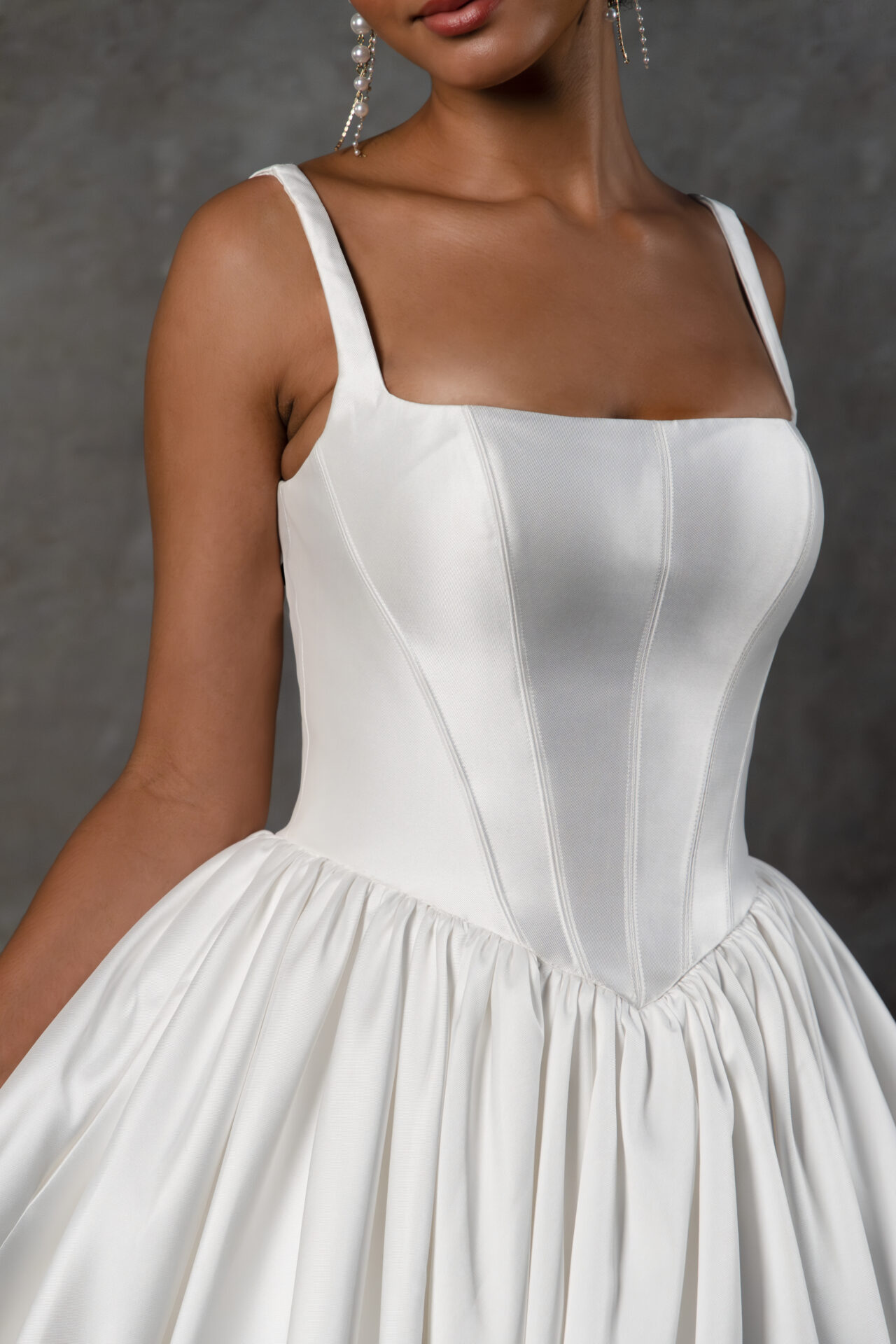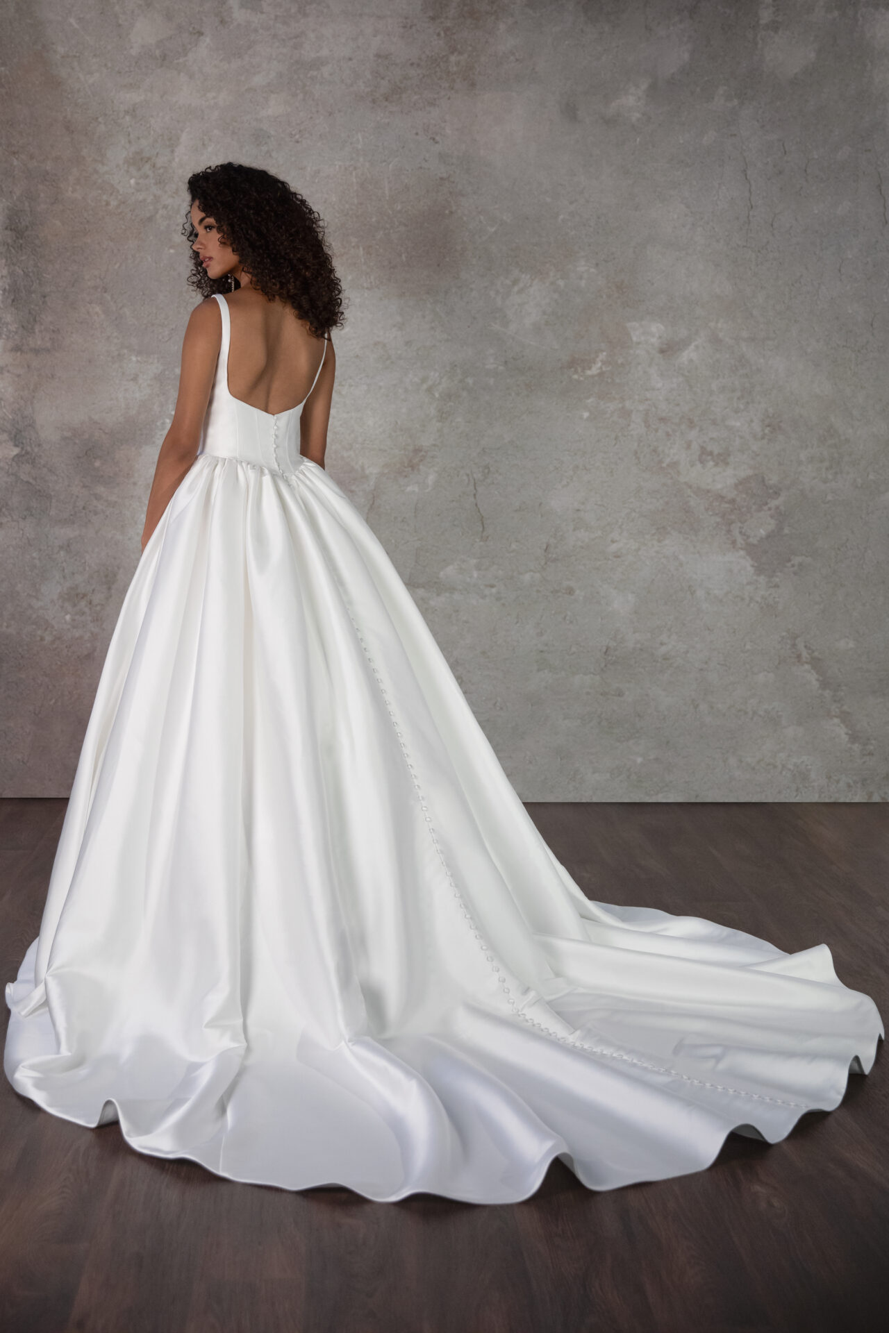 Regal elegance meets modern charm in this grand princess ballgown wedding dress in luxe Mikado fabric. Luna features classic squared shoulder straps that join a chic square neckline, framing a fitted bodice with architectural seams that complement the angled Basque waistline.