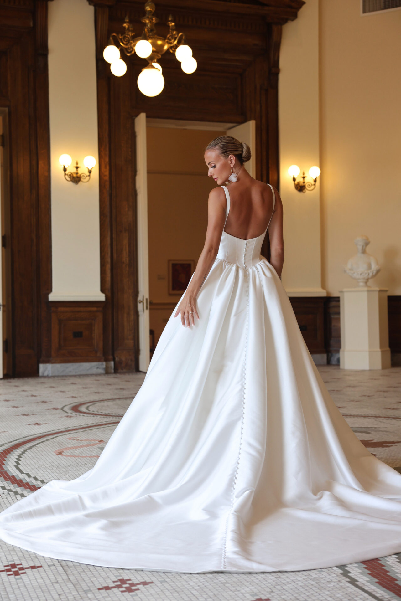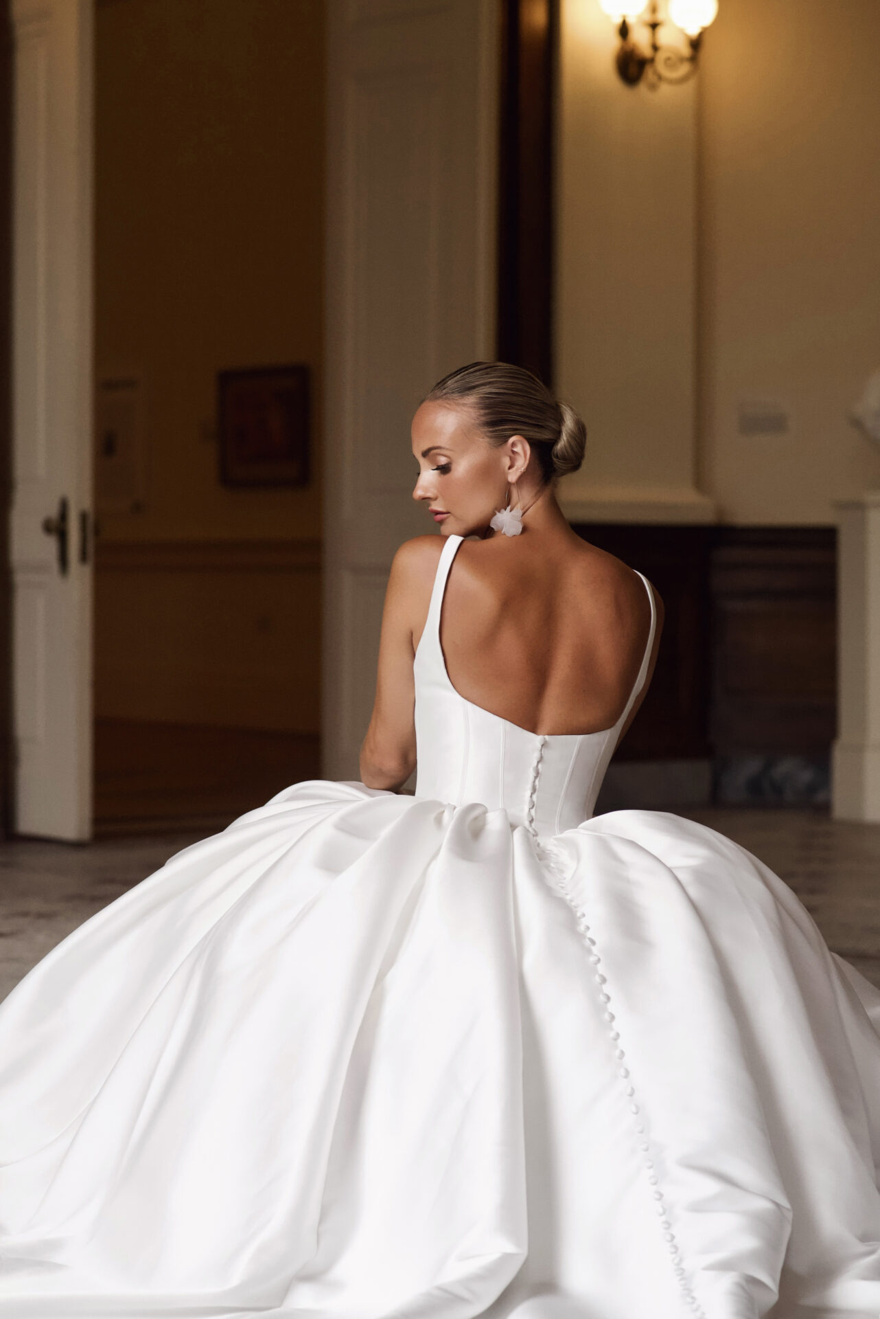 From the waist, a full and gathered Mikado skirt billows outward, forming a majestic ballgown silhouette.