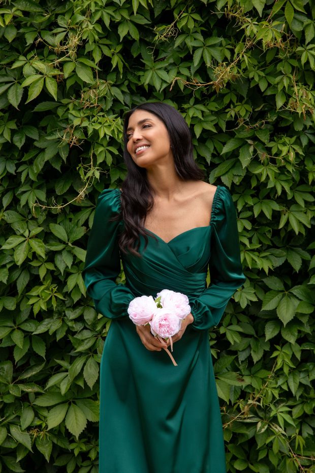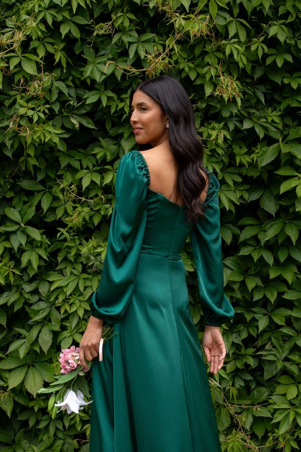 This gorgeous bridesmaid dress is crafted from luxurious liquid satin, featuring a sweetheart neckline paired with long, elasticated sleeves that can be styled on or off the shoulder to suit your look. The bodice is gently pleated at the waist to enhance your figure, flowing effortlessly into a draped A-line skirt. A soft V-shape and delicate button fastening at the back complete this elegant design.