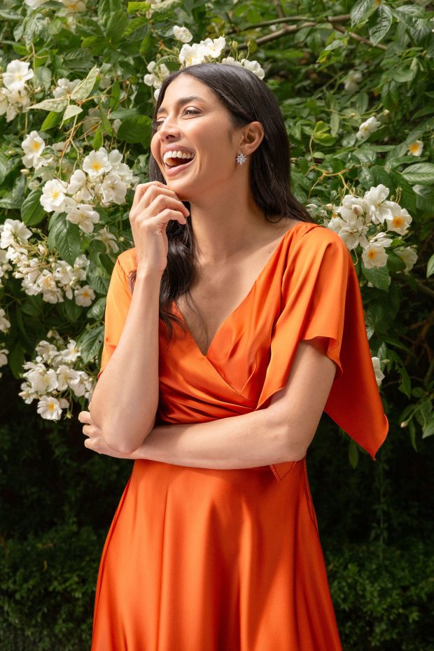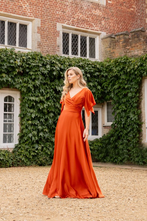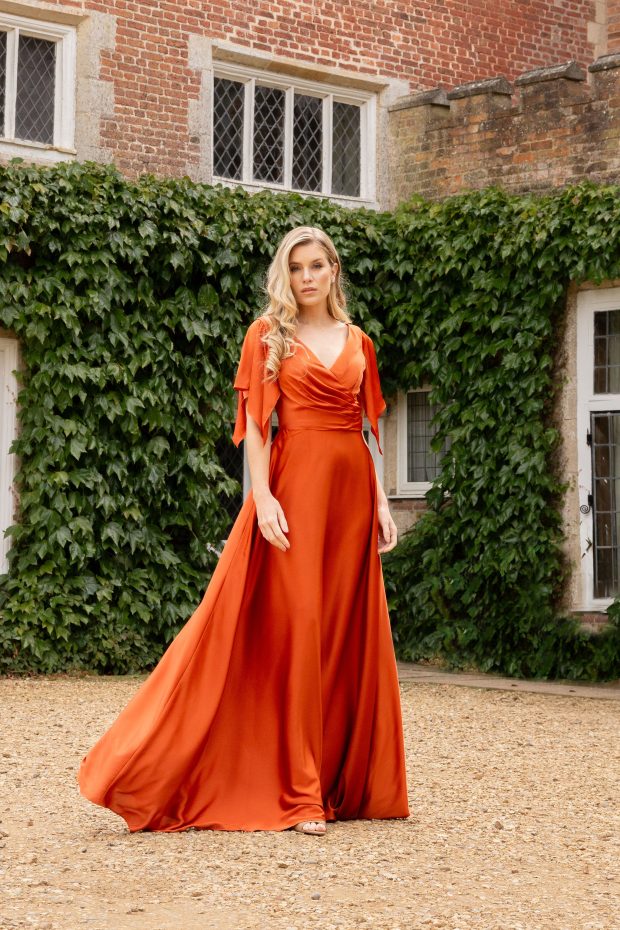 This luxurious bridesmaid dress is crafted from liquid satin fabric, featuring a wrap-over bodice with delicate pleating that beautifully defines the waist. Whimsical handkerchief sleeves offer light coverage while adding a touch of romance to the design. The flowing satin skirt falls elegantly to the hem, and a discreet zip closure at the back completes the look.